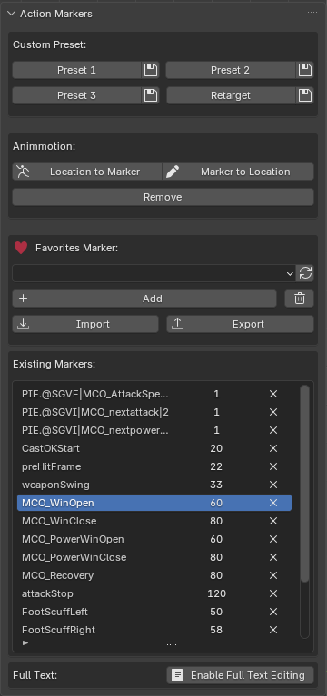 - Export (Check icon): Saves all markers in the current action to the corresponding preset file.
