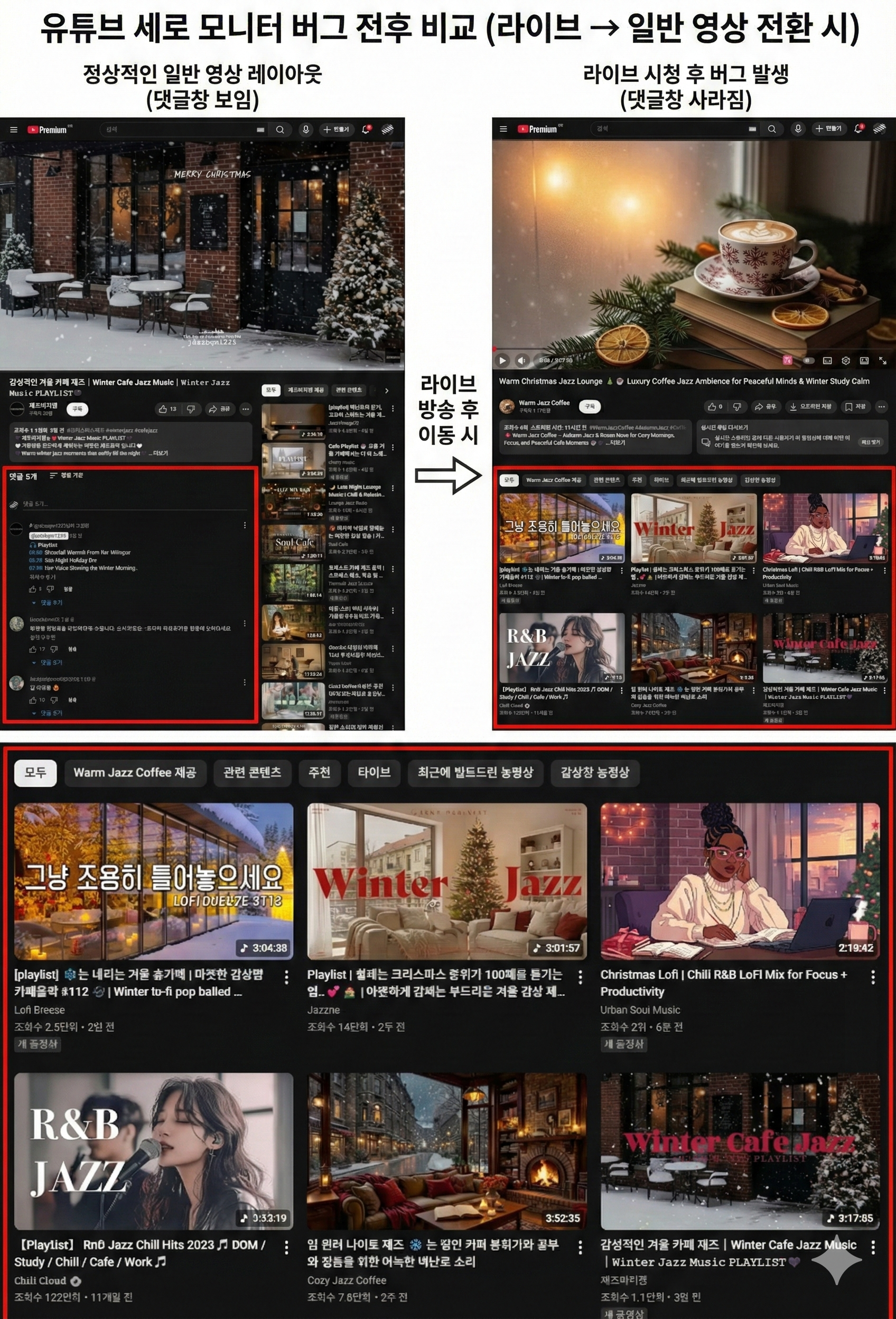브라우저가 "어? 방금까지 라이브였는데?" 하고 착각하여, 일반 영상에서도 라이브용 레이아웃(빈 공간)을 유지하려다가 댓글창을 제대로 불러오지 못하는 것입니다.